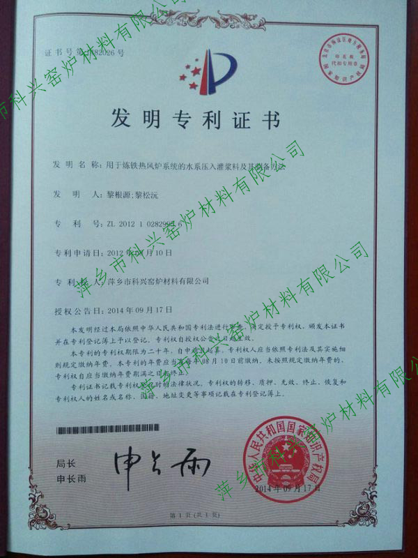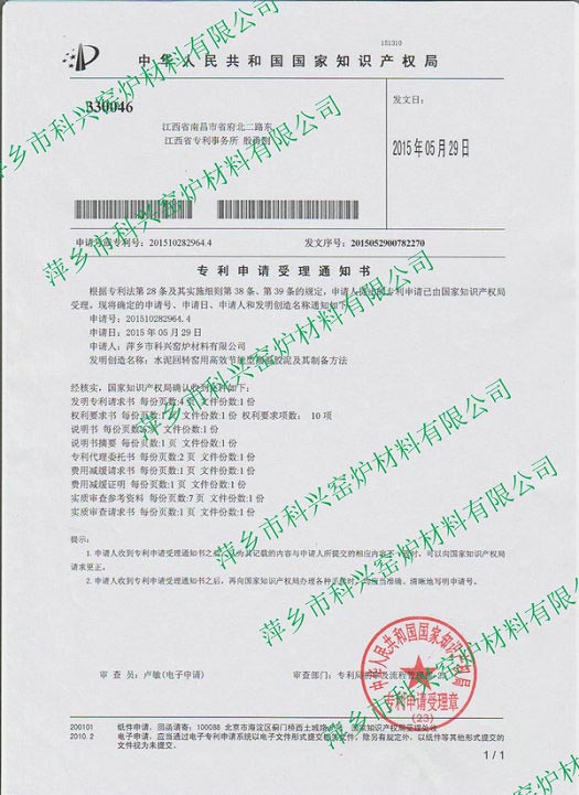 高溫膠泥發(fā)明專(zhuān)利受理通知書(shū)